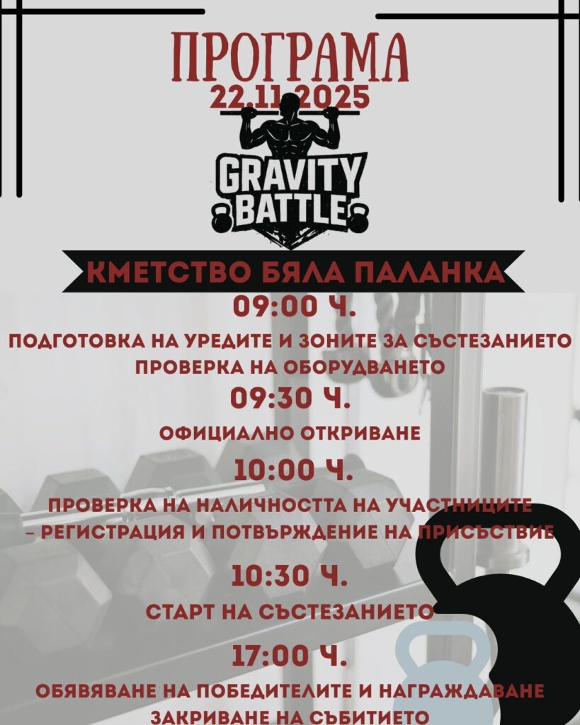 Събитието ще бъде съпътствано от спортен турнир по калистеника (уличен фитнес), организиран от клуб Gravity Battle.