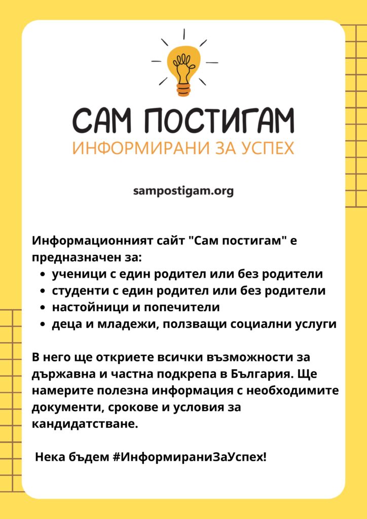 Платформата sampostigam.org е създадена с цел да предоставя актуална и достъпна информация за ученици и студенти, които нямат родители или са в грижи на един жив родител, настойници или попечители. Тя е насочена към младежи, които са отраснали в социални институции като Центрове за настаняване от семеен тип (ЦНСТ) или други подобни услуги, както и към тези, които са възпитавани в семейства на роднини и близки.